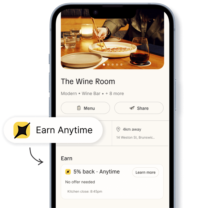Tap your EatClub Digital Card at participating venues to instantly earn Dining Credit, automatically added to your wallet and ready to spend on your next dine-in EatClub offer. Just look out for the 'Earn Anytime' badge on the venue.
